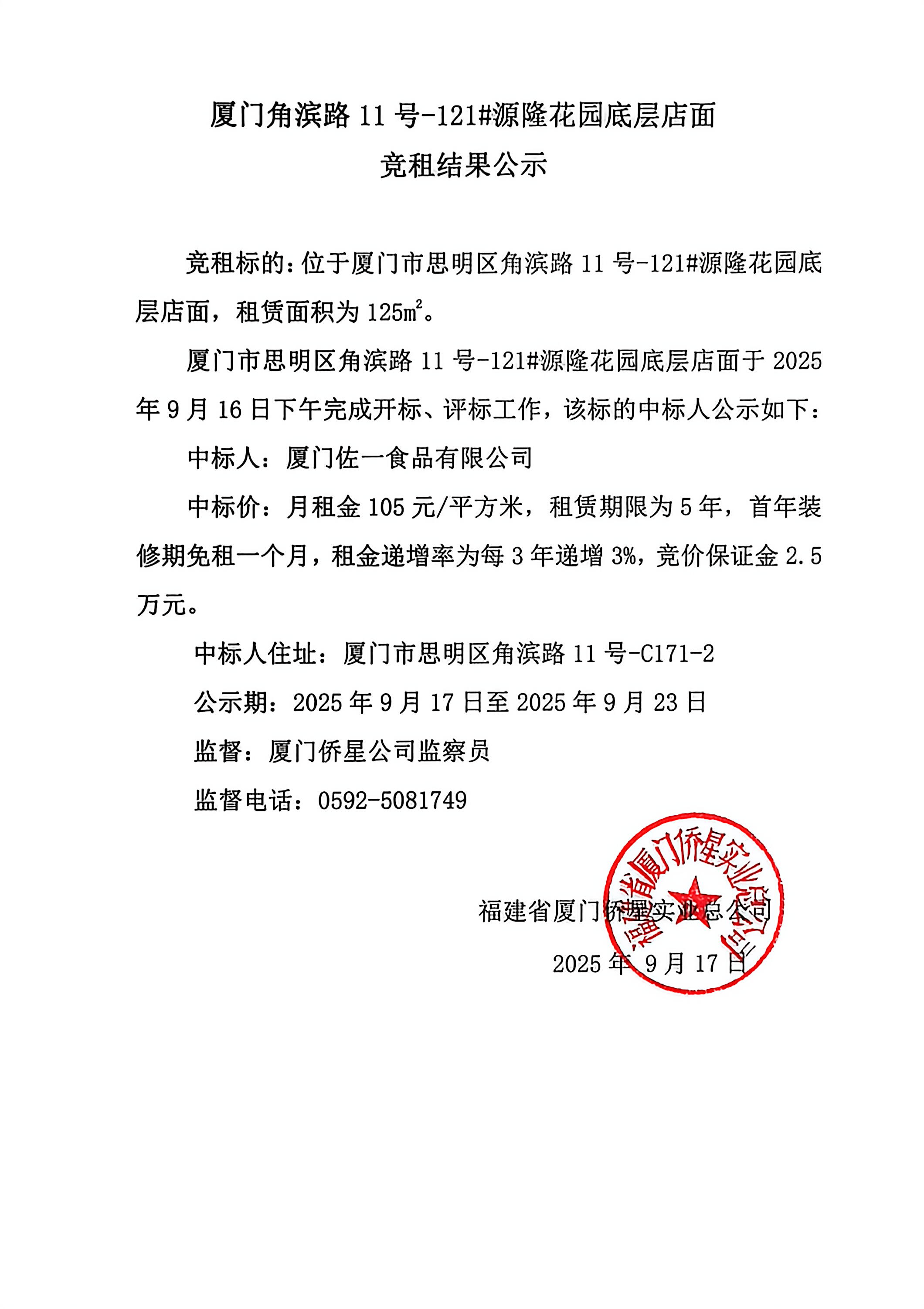 廈門角濱路11號(hào)-121#源隆花園底層店面竟租結(jié)果公示
